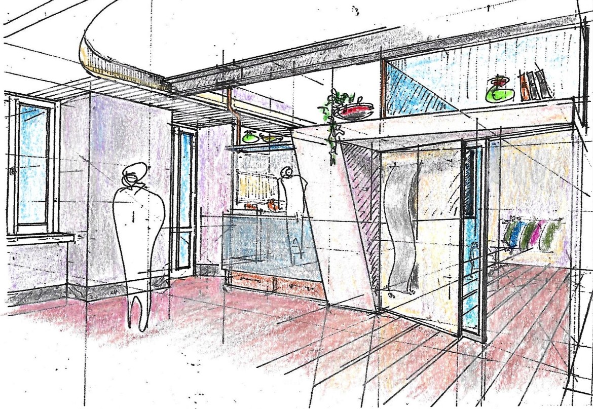 Ristrutturazione, arredo e allestimento abitazione, elementi di peculiarità a forte  caratterizzazione ambientale a mezzo di volumi con pareti curve e colori dirompenti.  Appartamento in Roma. Area soggiorno-studio